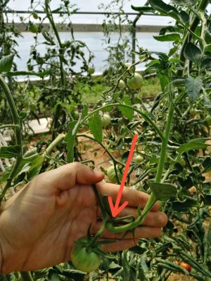- Fruchtastmutationen: Bei den Tomaten bilden sich an den Enden der Fruchtäste gelegentlich neue Triebe. Diese erkennt man daran, dass sie ein U machen um wieder nach Oben zu wachsen. Diese sind nach der letzten Tomate des Fruchtasts abzuschneiden. Achtung: Evtl. hat der neue Trieb bereits wieder einen Blütenast gebildet, erkennbar daran, dass diese in der Entwicklung dem eigentlichen Blütentrieb weit hinterher sind. Diese kommen grundsätzlich auch weg, da sie die Reifung der übrigen Tomaten an dem Ast verlangsamen würden.